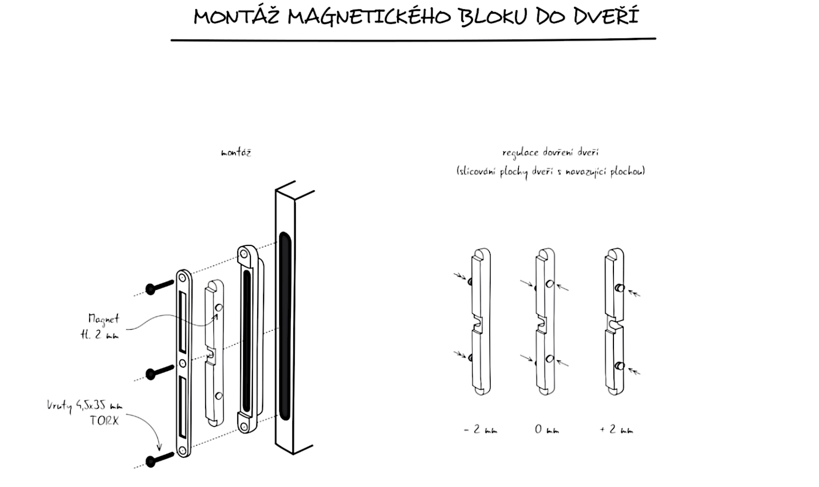Připravili jsme inovativní systém ovládání dveří bez kliky, bez zámku, bez elektroniky. Do Magneticu jsme zapracovali řadu velmi silných magnetů a umístili je do dveřní zárubně, naproti do dveřního křídla jsme zasadili blok z magnetické nerez oceli. Při dovírání dveří se k sobě obě části přiblíží a působením magnetické síly zajistí plynulé dokonalé dovření. Magnetic dveře spolehlivě ovládá a uzavírá, ale nezamyká. Pro potřeby úplného uzamčení jsme připravili mini zámečky s variantou WC/koupelna a bezpečného uzamčení s cylindrickou vložkou. Systém je prioritně připraven pro otočné interiérové dveře, kde díky možnosti jednoduché jemné regulace síly magnetů při dovírání dveří poskytuje uživateli nečekanou přidanou hodnotu.