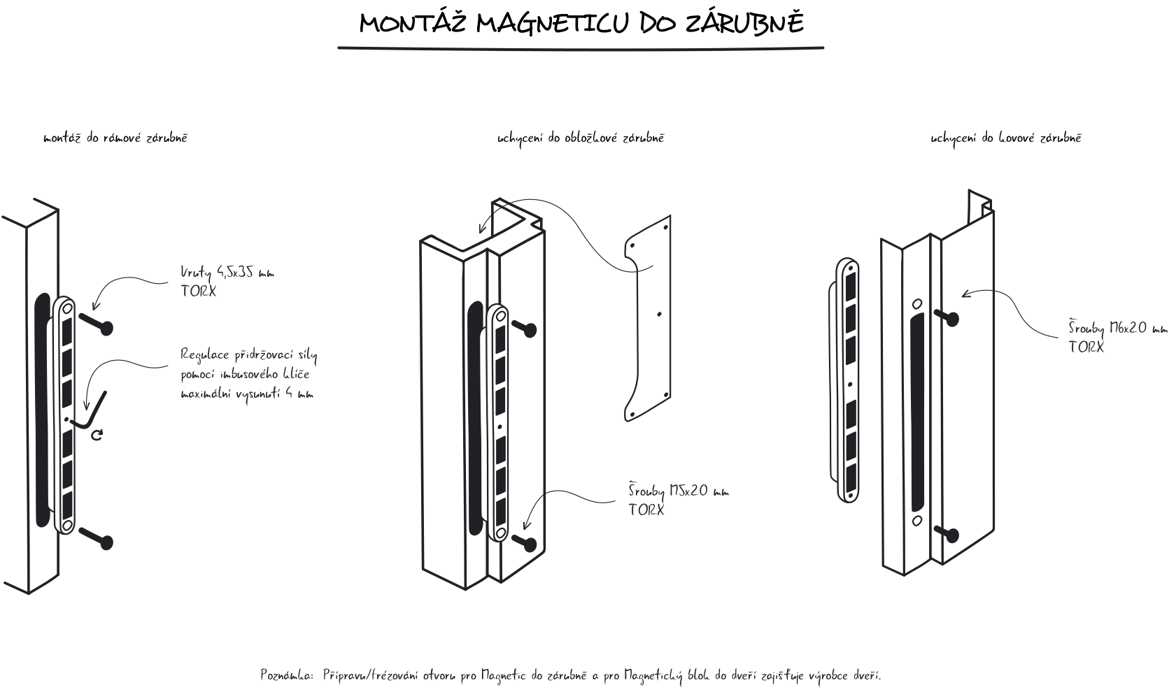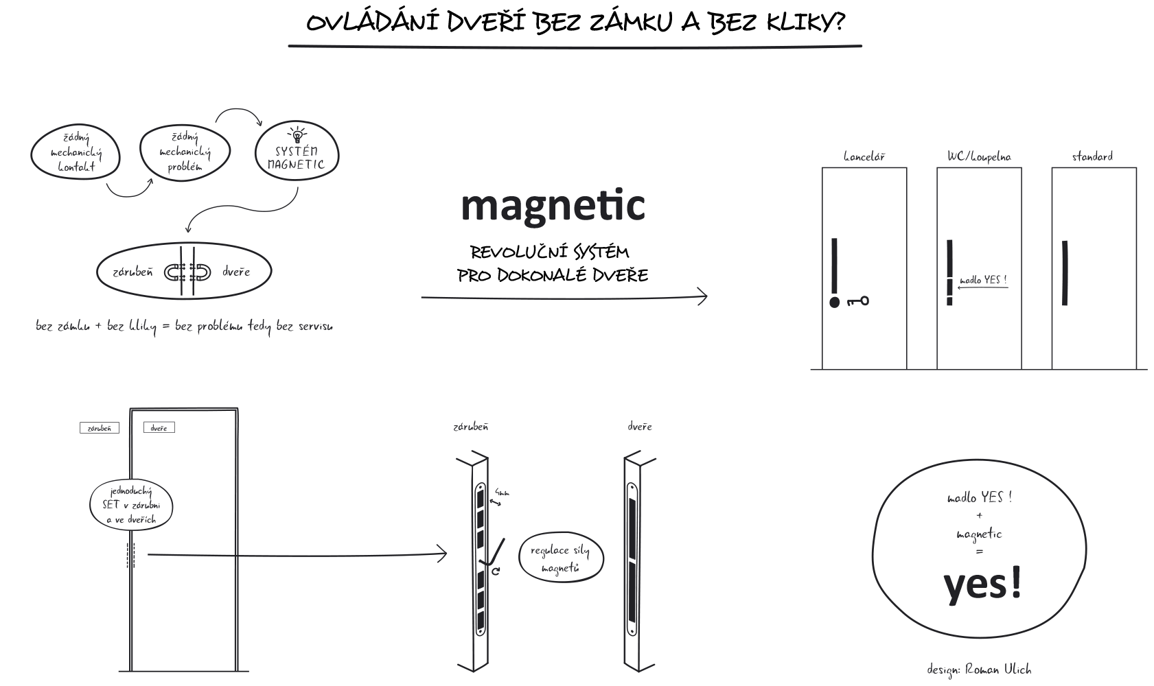 Připravili jsme inovativní systém ovládání dveří bez kliky, bez zámku, bez elektroniky. Do Magneticu jsme zapracovali řadu velmi silných magnetů a umístili je do dveřní zárubně, naproti do dveřního křídla jsme zasadili blok z magnetické nerez oceli. Při dovírání dveří se k sobě obě části přiblíží a působením magnetické síly zajistí plynulé dokonalé dovření. Magnetic dveře spolehlivě ovládá a uzavírá, ale nezamyká. Pro potřeby úplného uzamčení jsme připravili mini zámečky s variantou WC/koupelna a bezpečného uzamčení s cylindrickou vložkou. Systém je prioritně připraven pro otočné interiérové dveře, kde díky možnosti jednoduché jemné regulace síly magnetů při dovírání dveří poskytuje uživateli nečekanou přidanou hodnotu.
